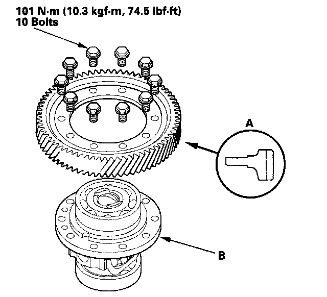 1. Remove the final driven gear (A) from the differential carrier (B). The final driven gear bolts have left-hand threads.