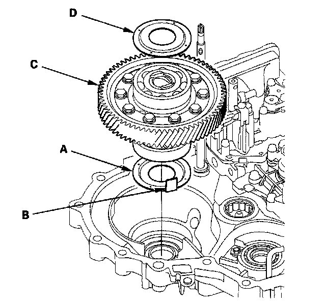 2. Install the differential assembly (C) in the torque converter housing, and put the spacer (D) on the differential.