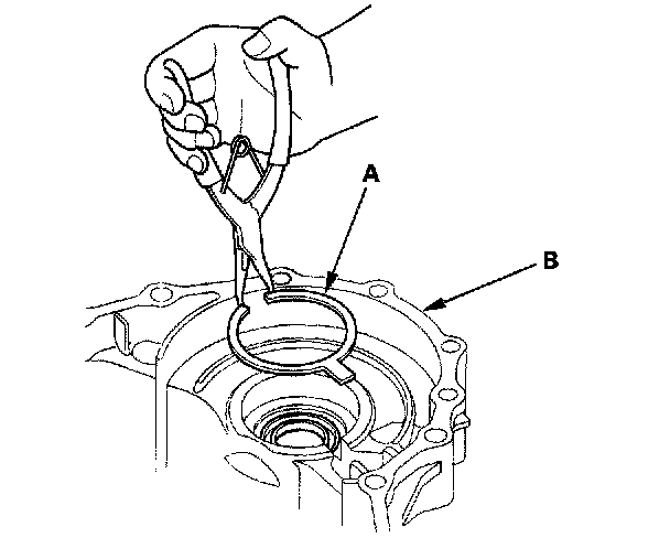 1. Install the spacer (A) in the torque converter housing with the spacer tab (B) in the guide. Do not mix-up the spacers between in the transmission housing and the torque converter housing.