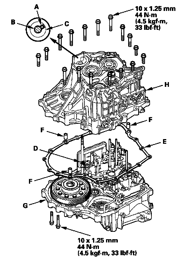 7. Place the transmission housing (H), and install the transmission mounting bolts (17 bolts) and tighten the bolts to 44 Nm (4.5 kgf-m, 33 lbf-ft) in a crisscross pattern in two or more steps.