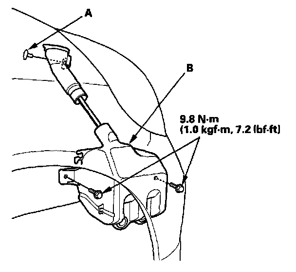4. Remove the two bolts and clip (A), then remove the washer reservoir (B).