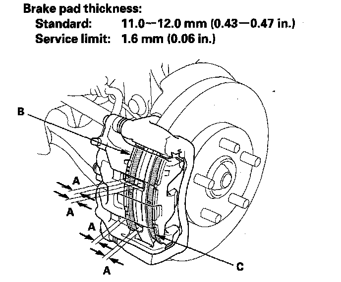 3. Check the thickness (A) of the inner pad (B) and outer pad (C). Do not include the thickness of the backing plate.