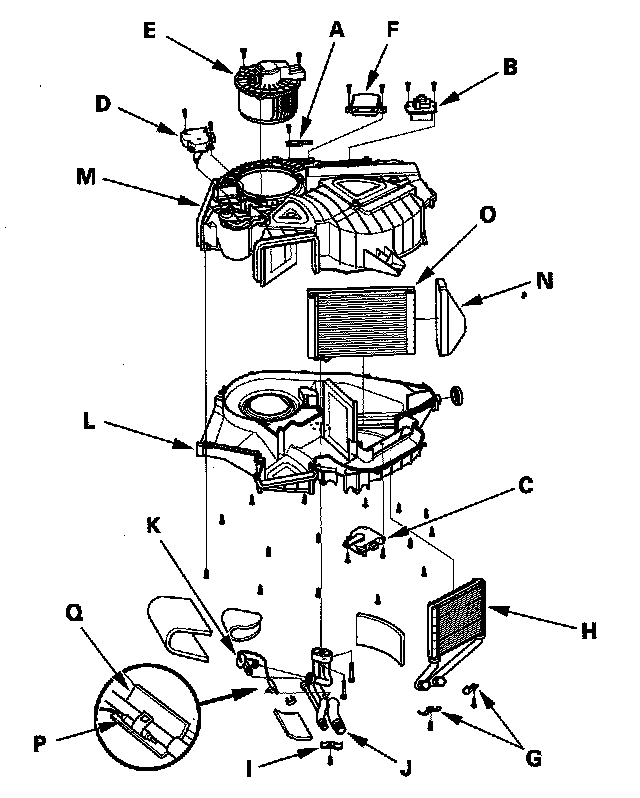 3. Remove the self-tapping screws, carefully separate the right housing (L) from the left housing M), then remove the insulator (N) and the evaporator core (O).