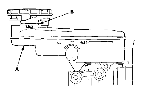 1. Make sure the brake fluid level in the reservoir (A) is at the MAX (upper) level line (B).