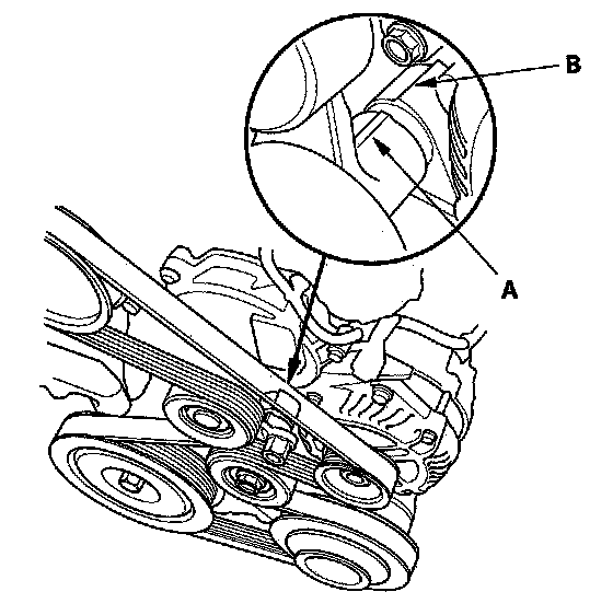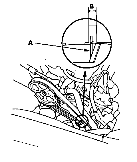 2. Check that the auto-tensioner indicator (A) on the oil pump not beyond the edge of the indicator rib (B) on the auto-tensioner. If the pointer is beyond the indicator rib, replace the drive belt.