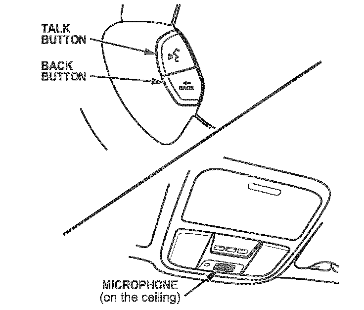 The navigation system features a voice control system. This system uses voice recognition for hands-free operation of most of the navigation, audio, and climate control system functions. The voice control system consists of the TALK and BACK buttons on the steering wheel and a microphone on the ceiling. This system is intended as the primary way to give commands to the system.