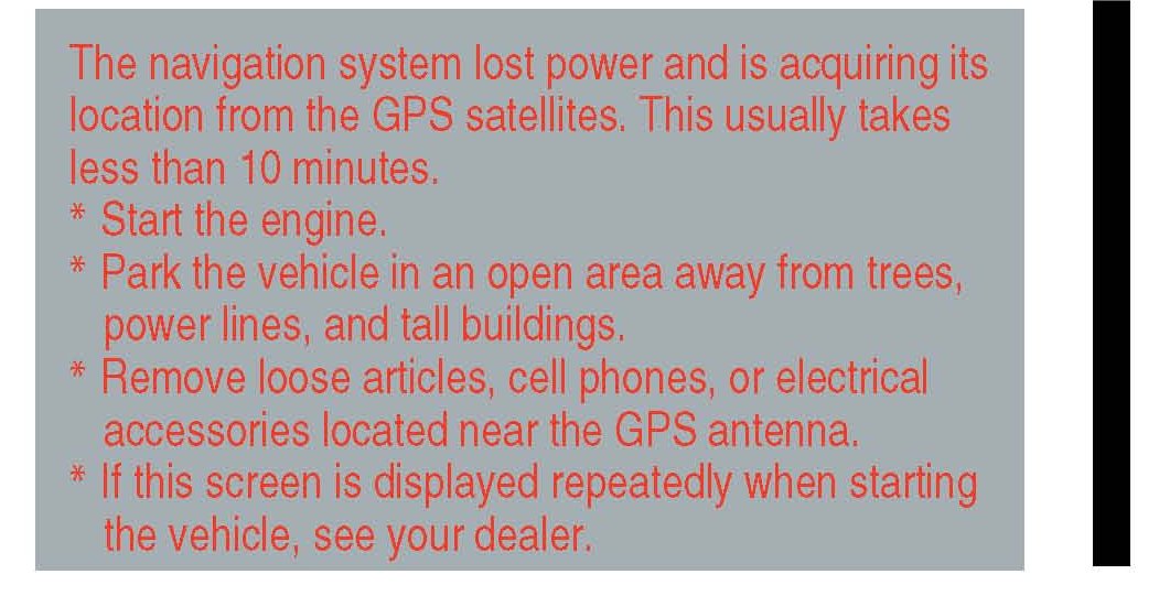 The initialization screen may appear after battery voltage to the navigation unit has been disconnected for more than 5 minutes. If this occurs, follow the on-screen instructions. If you are still unable to obtain GPS initialization, refer to the service manual for diagnostic information.