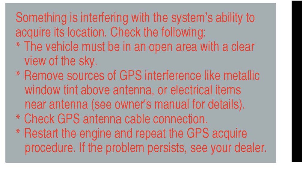 ^ The GPS antenna receives location information from orbiting satellites. Anything that blocks or interferes with the signal will affect accuracy. The GPS signal can be blocked or interfered with (vehicle position shown incorrectly on the map) by: