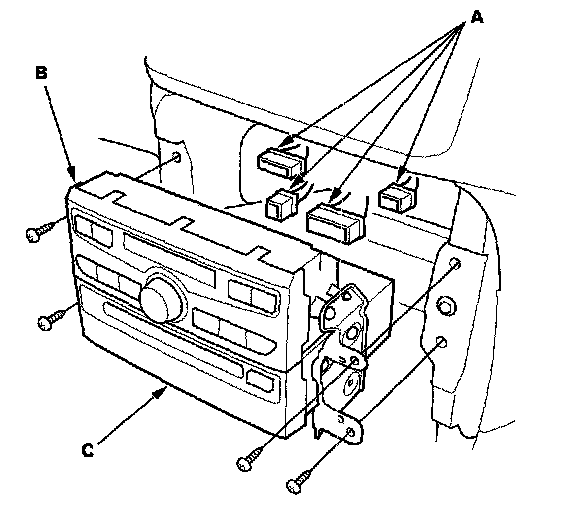2. Disconnect the connectors (A) from the climate control unit (B). and DVD player unit (C).