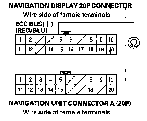 8. Check for continuity between the navigation display 20P connector terminal No. 15 and navigation unit connector A (20P) terminal No. 20.