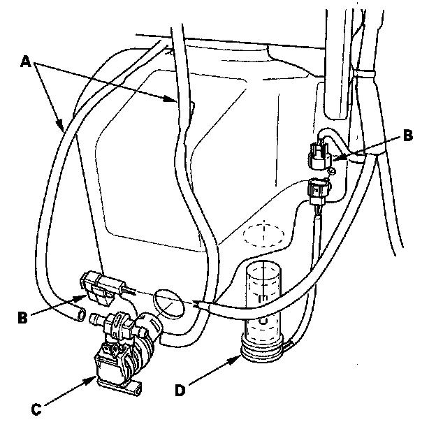 3. Disconnect the 2P connector (B) from the washer motor (C) and the washer fluid level switch (Canada) (D).