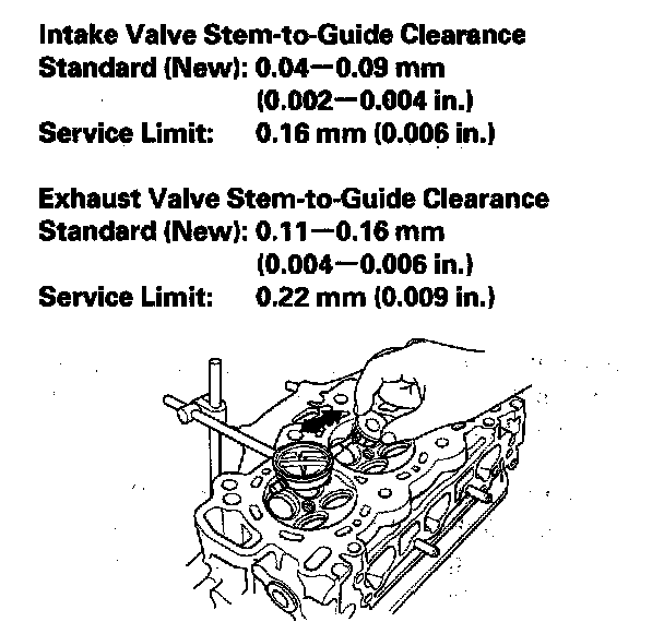 3. Subtract the O.D. of the valve stem, measured with a micrometer, from the I.D. of the valve guide, measured with an inside micrometer or ball gauge. Take the measurements in three places along the valve stem and three places inside the valve guide. The difference between the largest guide measurement and the smallest stem measurement should not exceed the service limit.