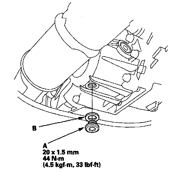 4. Reinstall the drain plug with a new sealing washer (B). Tighten the drain plug to the specified torque.