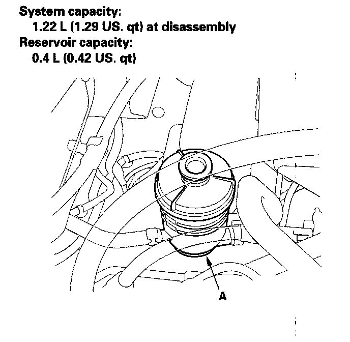 Fluid ReplacementCheck the reservoir (A) at regular intervals, and add the recommended fluid as necessary. Always use Honda Power Steering Fluid. Use of any other type of power steering fluid or automatic transmission fluid can cause increased wear and poor steering in cold weather.