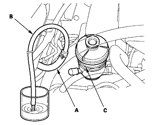 2. Connect a hose (B) of suitable diameter to the disconnected return hose, and put the hose end in a suitable container.