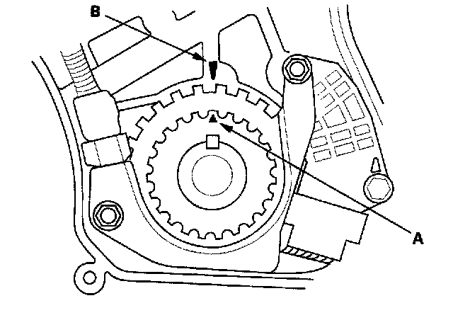 2. Set the timing belt drive pulley to top dead center (TDC) by aligning the TDC mark (A) on the tooth of the timing belt drive pulley with the pointer (B) on the oil pump.