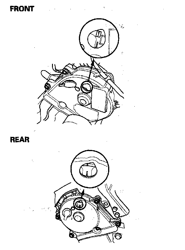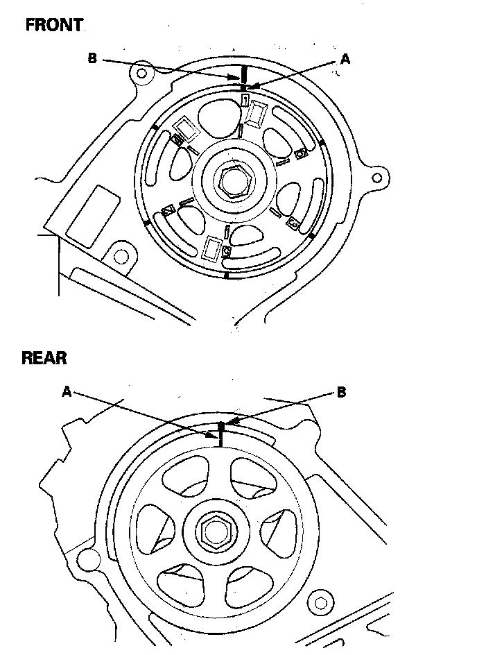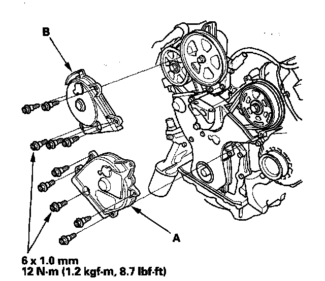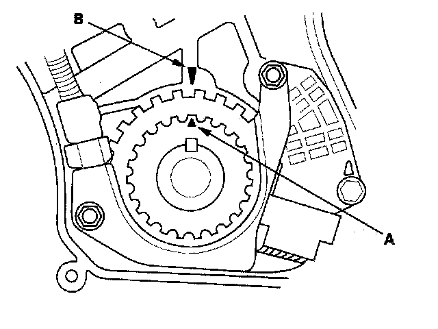 3. Set the timing belt drive pulley to top dead center (TDC) by aligning the TDC mark (A) on the tooth of the timing belt drive pulley with the pointer (B) on the oil pump.