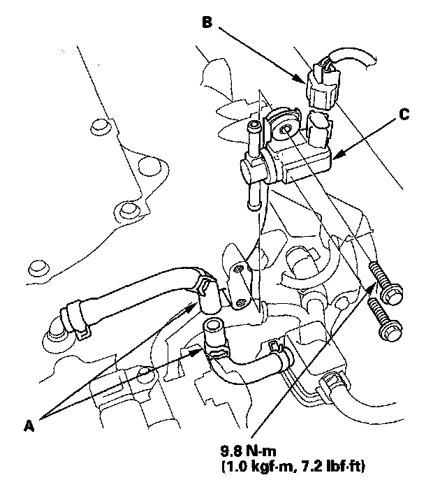 2. Disconnect the hoses (A) and the EVAP canister purge valve 2P connector (B).
