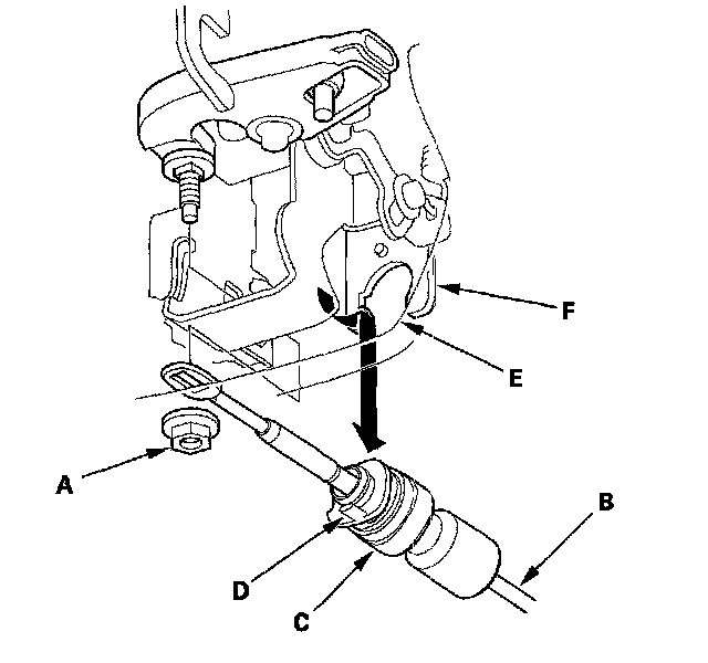 5. Rotate the socket holder (C) on the shift cable a quarter turn; the tab (D) on the socket holder will be in the opening (E) of the socket holder bracket (F). Then slide the holder to remove the shift cable from the socket holder bracket.