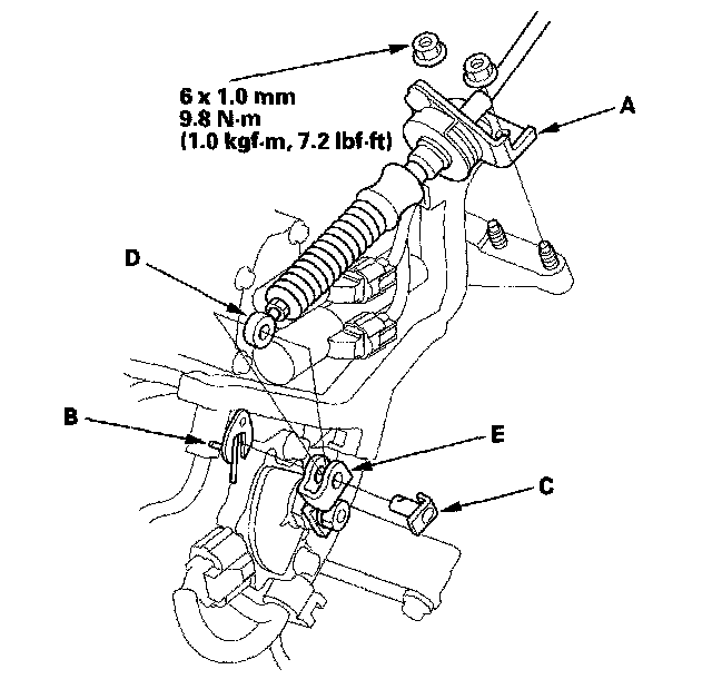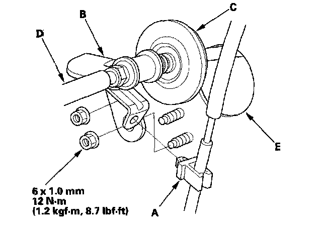 12. Remove the spring clip/washer (B) and control pin (C), then separate the shift cable end (D) from the control lever (E).