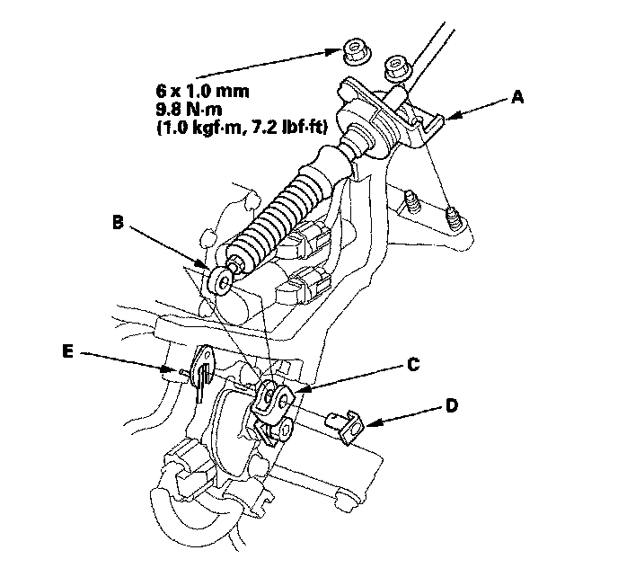 15. Insert the new shift cable through the grommet hole (E), and install the grommet in its hole. Do not bend the shift cable excessively.