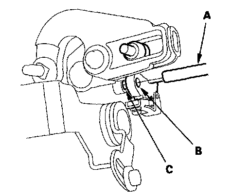 21. Place the shift lever in the N position, then insert a 6.0 mm (0.24 in.) pin (A) through the positioning hole (B) on the detent plate, and into the positioning hole (C) on the control bracket. The shift lever is secured in the N position.