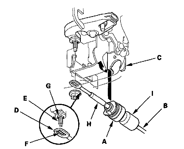 22. Align the socket holder (A) on the shift cable (B) with the slot in the socket holder bracket (C), then slide the holder into the bracket. Install the shift cable end (D) over the mounting stud (E) by aligning its square hole (F) with the square fitting (G) at the bottom of the stud. Rotate the holder a quarter turn to secure the shift cable. Do not install the shift cable by, twisting the shift cable guide (H) and damper (I).