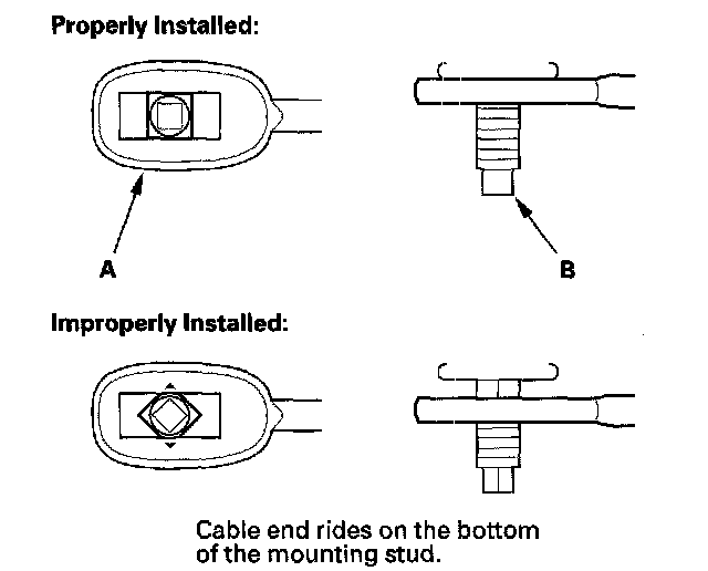 23. Verify that the shift cable end (A) is properly installed on the mounting stud (B).