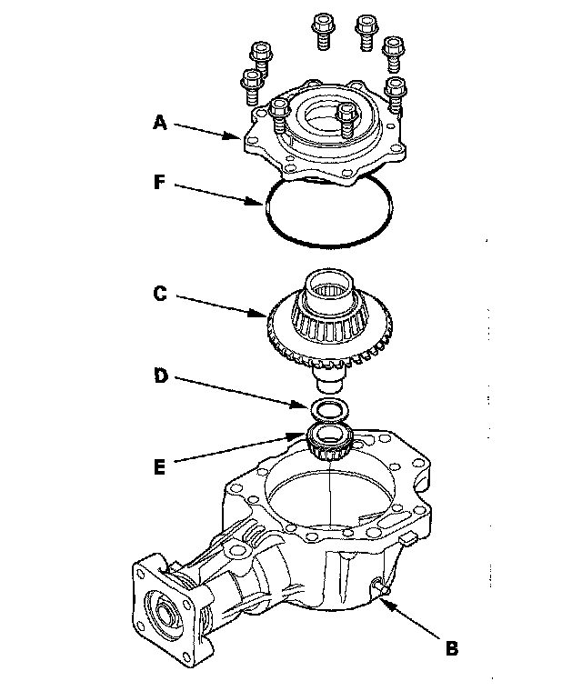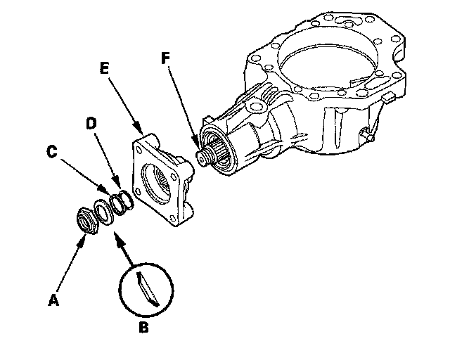 9. Remove the locknut (A), conical spring washer (B), back-up ring (C), O-ring (D), and companion flange (E) from the transfer output shaft (hypoid gear) (F).