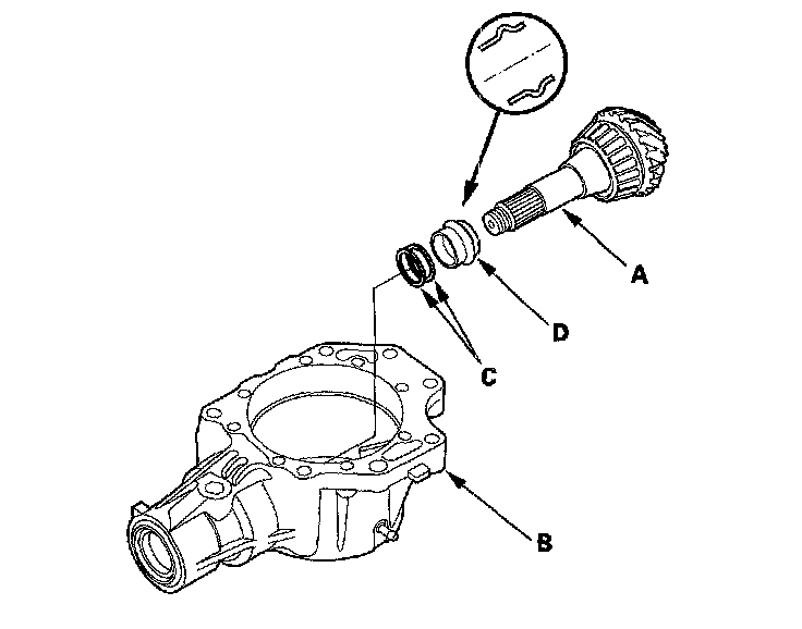 10. Remove the transfer output shaft (hypoid gear) (A) from the transfer housing (B), then remove the thrust washers (C) and transfer spacer (D) from the transfer output shaft (hypoid gear).