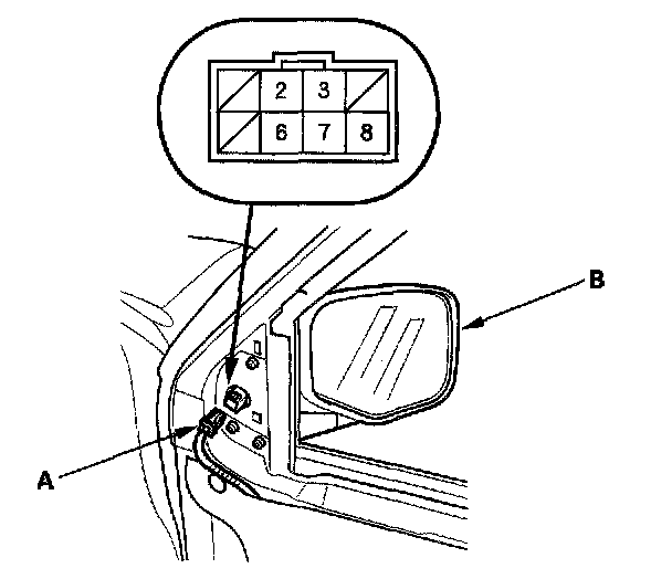 2. Disconnect the 8P connector (A) from the power mirror actuator (B).