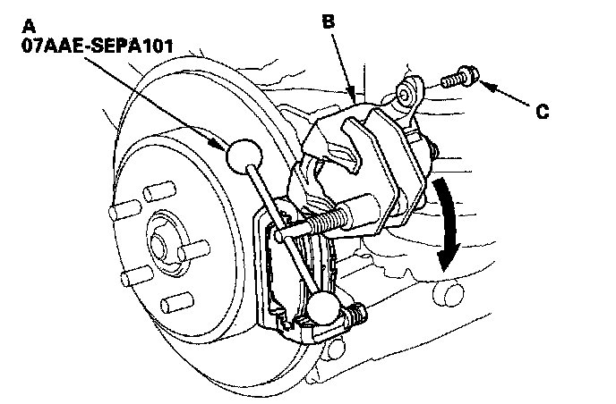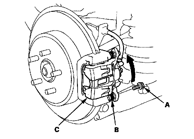 4. Remove the flange bolt (A) while holding the caliper pin B with a wrench being careful not to damage the pin boot, and pivot the caliper (C) up out of the way. Check the hose and pin boots for damage and deterioration.