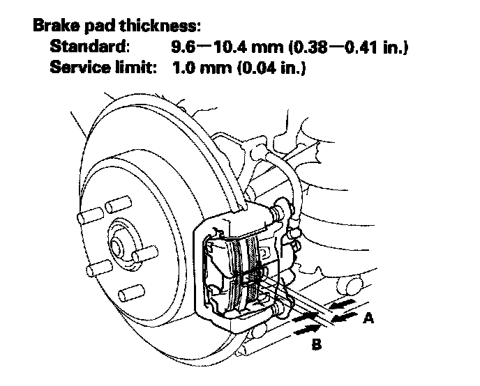 3. Check the thickness of the inner pad (A) and the outer pad (B). Do not include the thickness of the backing plate.