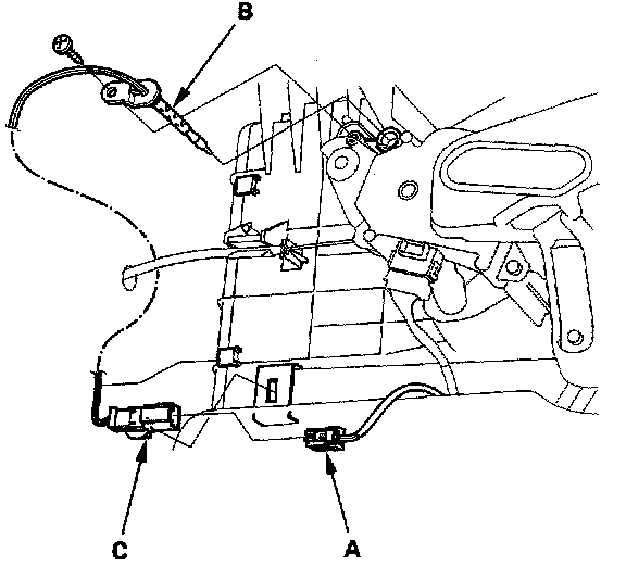 2. Disconnect the 2P connector (A) from the evaporator temperature sensor (B), then remove the connector clip (C). Remove the self-tapping screw, and carefully pull out the evaporator temperature sensor.