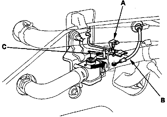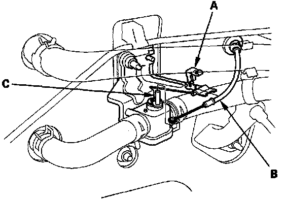 Heater Valve Cable Adjustment1. From under the hood, open the cable clamp (A), then disconnect the heater valve cable (B) from the heater valve arm (C).
