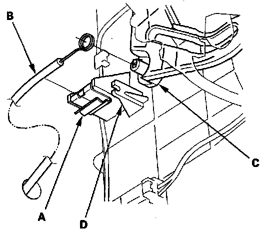 4. Attach the heater valve cable (B) to the air mix control linkage (C) as shown step 2. Hold the end of the heater valve cable housing against the stop (D), then snap the heater valve cable housing into the cable clamp (A).