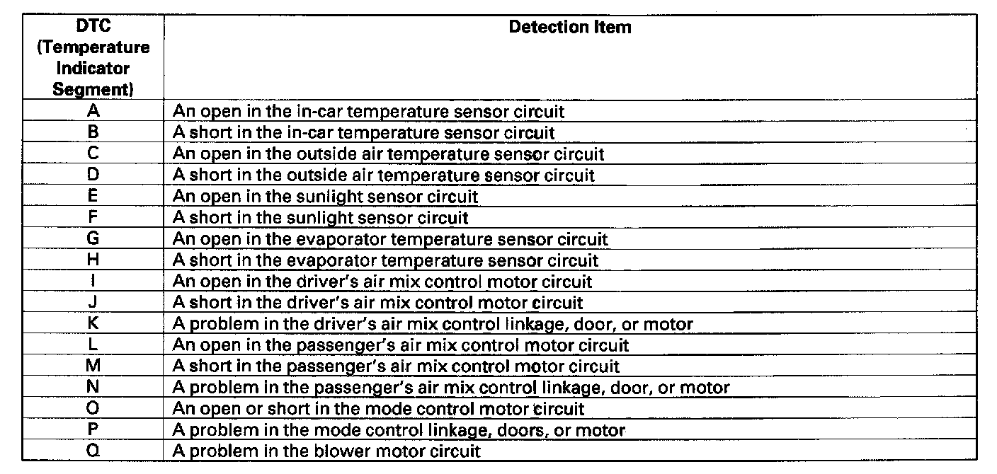 - If there is any problem in the system, the temperature indicator will light up the segment (A through Ohm) corresponding to the error. The temperature indicator will then alternate every second between displaying "88" (all segments lit) and the error code segment (A through Q). To determine the meaning of the DTC, refer to checking for DTCs.