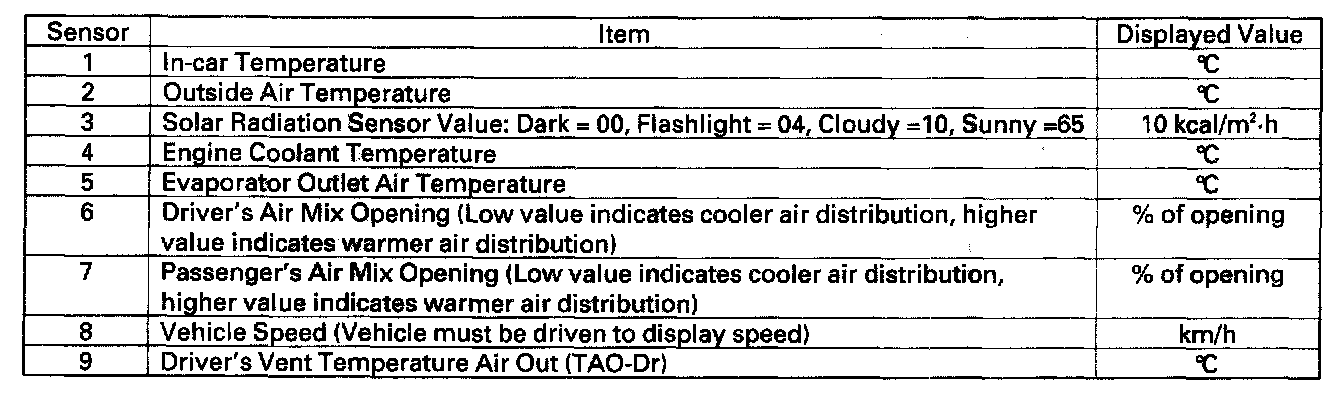 The climate control unit has a mode that displays sensor inputs it receives. This mode shows you what the climate control unit is receiving from each of the sensors, one at a time, and it can help you determine if a sensor is faulty.