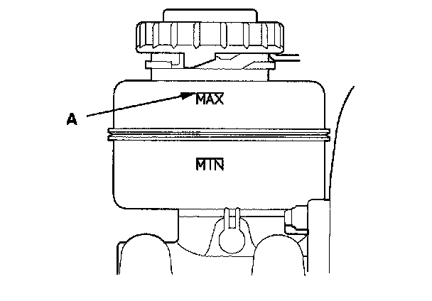 1. Make sure the brake fluid level in the reservoir is at the MAX (upper) level line (A).