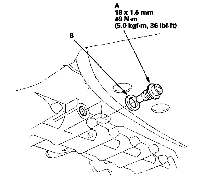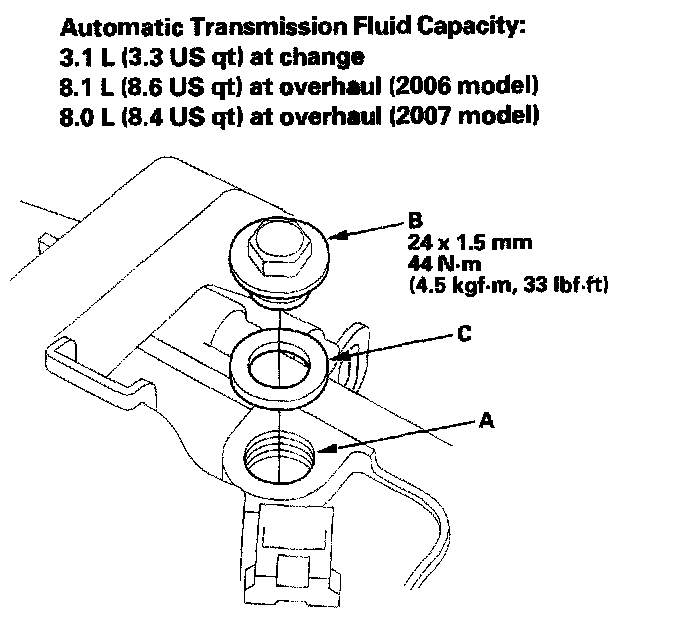 6. Install the ATF filler bolt (B) and a new sealing washer (C).