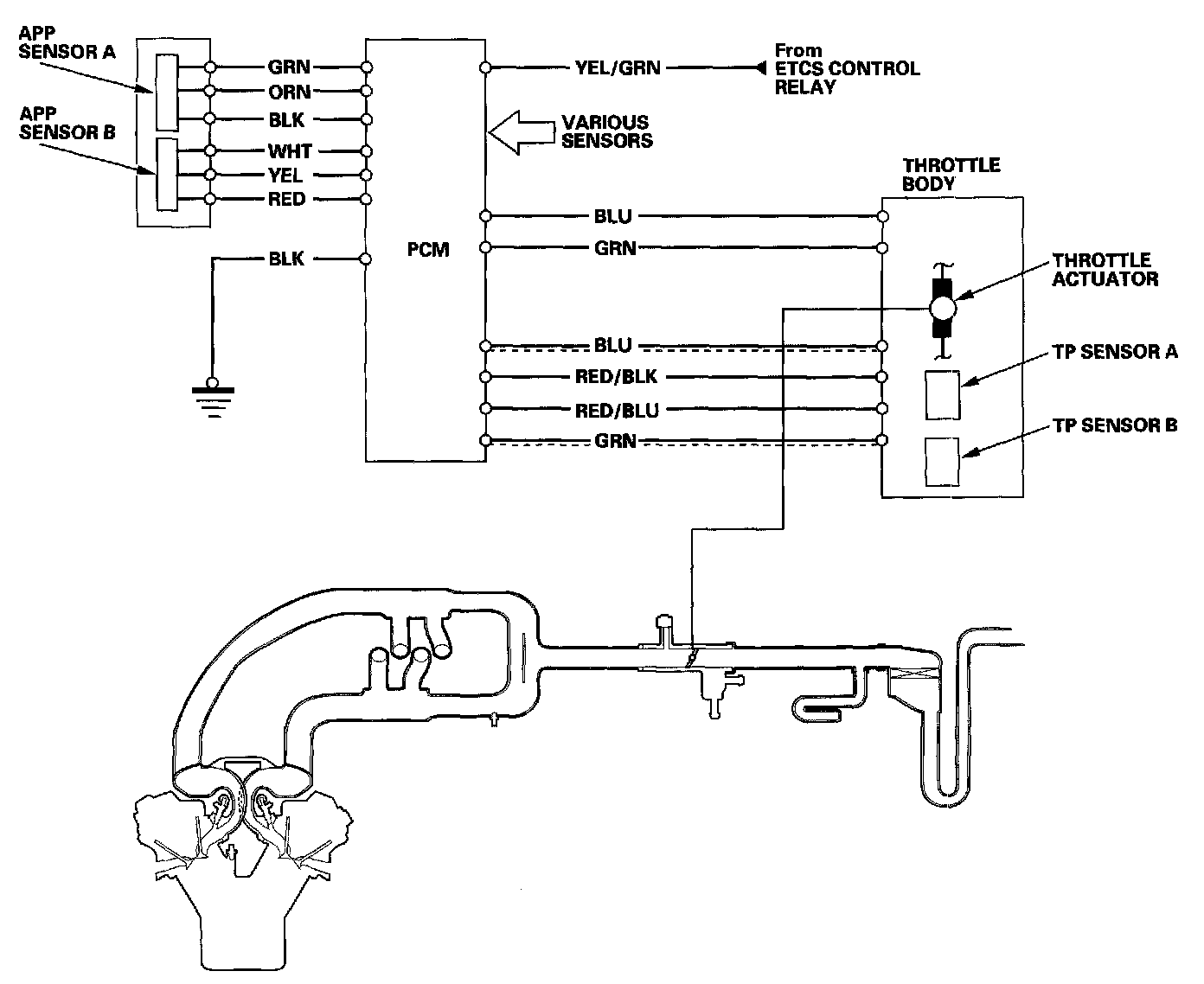 The electronic throttle control system consists of the throttle actuator, throttle position (TP) sensor A/B, accelerator pedal position (APP) sensor A/B, electronic throttle control system (ETCS) control relay, and the PCM.