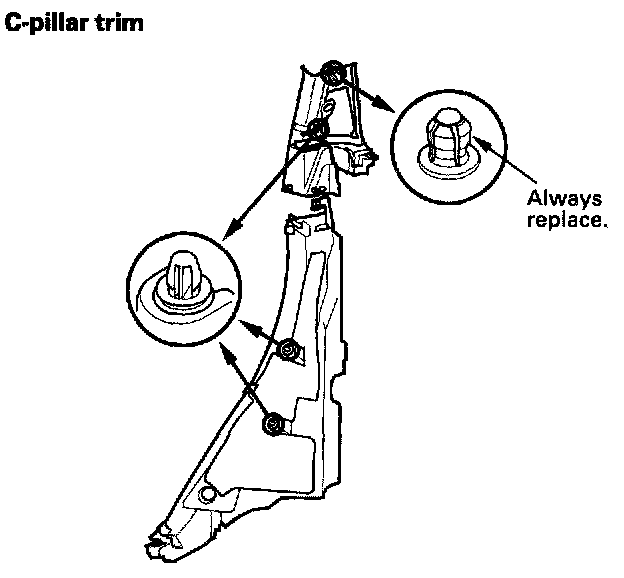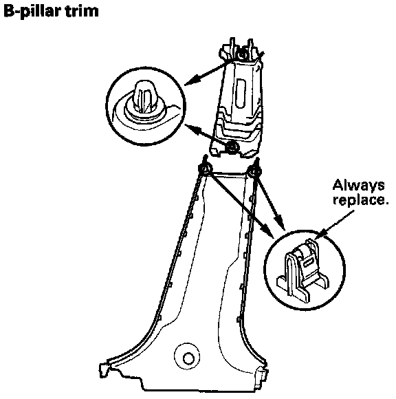 After a collision, where a side curtain airbag has deployed, replace all trim clips on that side, even if they appear to be undamaged. Replace the clips on these parts: