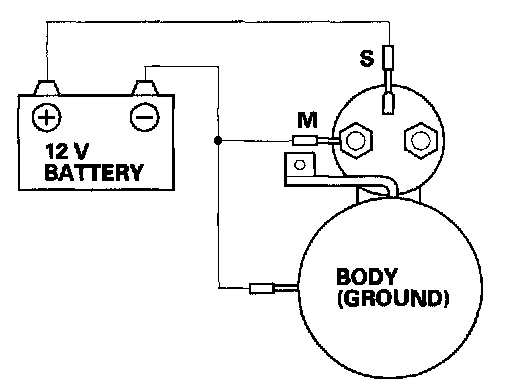 3. Connect the battery as shown. Make sure you disconnect the starter motor wire from the solenoid. If the starter pinion moves out, it is working properly.