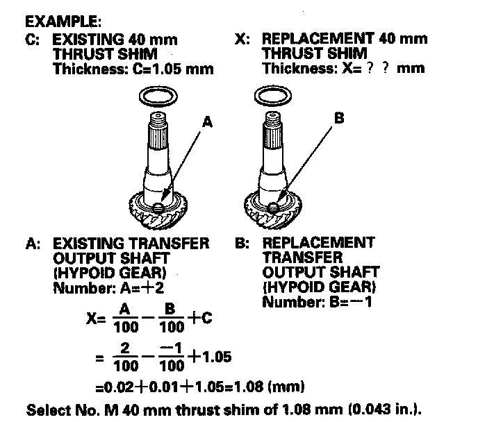 1. Select the 40 mm thrust shim if the transfer output shaft (hypoid gear) is replaced. Calculate the thickness of the 40 mm thrust shim using the formula below, and select the shim from the following table.