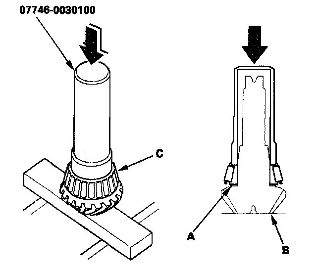 3. Install the 40 mm thrust shim (A) on the transfer output shaft (hypoid gear) (B), then install the tapered roller bearing (C) with the special tool and a press.