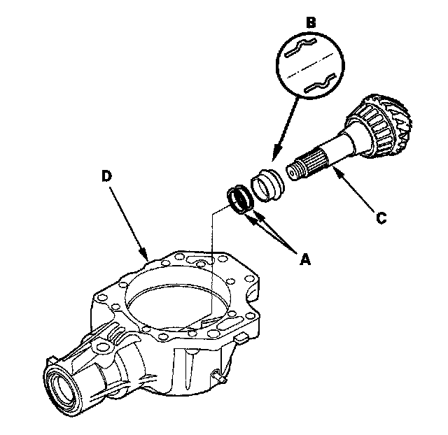 11. Install the tapered roller bearing (A), 25 mm thrust shim (B), and transfer hypoid drive gear/shaft assembly (C) in the transfer housing (D).