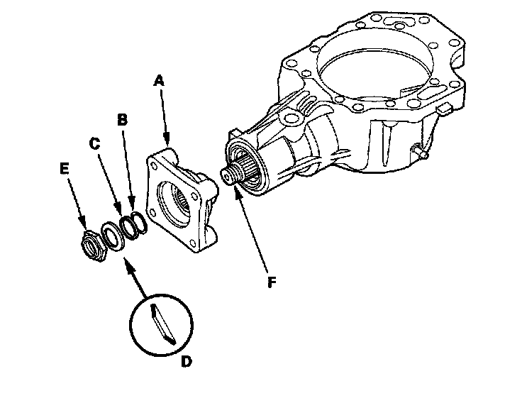 25. Install the companion flange (A), new O-ring (B), back-up ring (C), new conical spring washer (D), and new locknut (E) on the transfer output shaft (hypoid gear) (F). Install the conical spring washer in the direction shown.