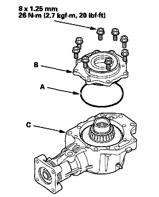 41. Install the new O-ring (A) on the transfer cover (B), then install the cover on the transfer housing (C).