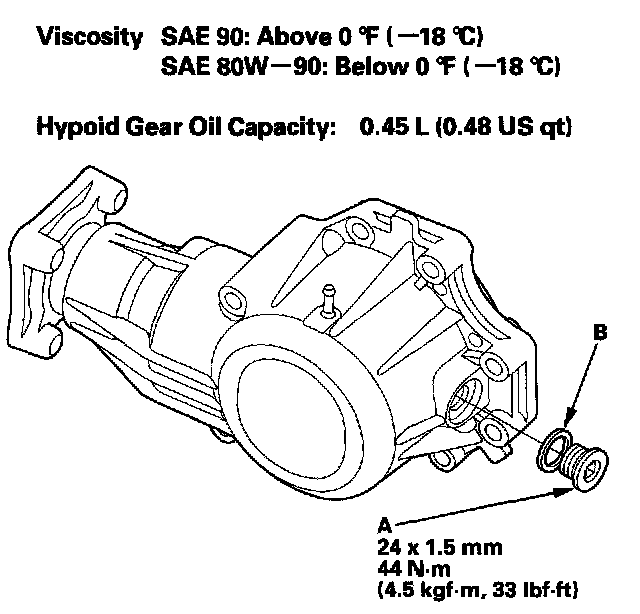 42. Remove the filler plug (A), then refill the transfer with transfer fluid (hypoid gear oil) into the filler hole. Use a SAE 90 or SAE 80W-90 viscosity hypoid gear oil, API classified GL4 or GL5 only.