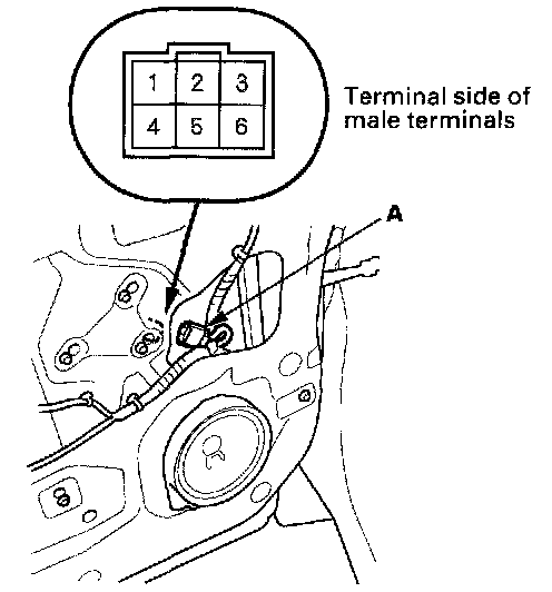 - Connect an analog voltmeter between the No. 3 (+) and No. 5 (-) terminals, and run the window motor down or up. The voltmeter needle should move back and forth alternately (a digital voltmeter should show the average voltage between 0 - 5 V).